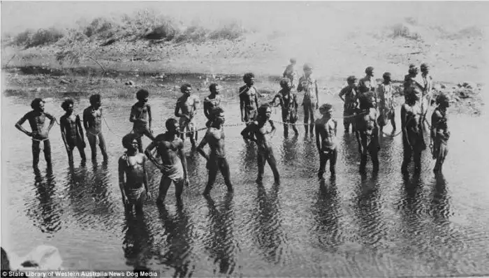 Эти 22 заключенных аборигена были сфотографированы стоящими в воде только в набедренных повязках, скованные одной цепью.