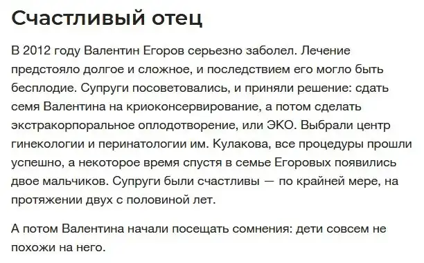 Мы можем бесконечно шутить о том, что кто-то кому-то "наставил рога", но когда дело касается вашего ребенка, становится уже совсем не смешно. Житель Москвы по имени Валентин Егоров решил сделать тест ДНК своим двоим сыновьям, но результаты его шокировали. По его мнению, врачи в клинике, в которой его жене делали искусственное оплодотворение, просто перепутали пробирки, и она забеременела от другого донора спермы. Что самое интересное, это вовсе не единичный подобный случай, а тесты на ДНК уже разрушили не одну семью в Европе и в Америке.