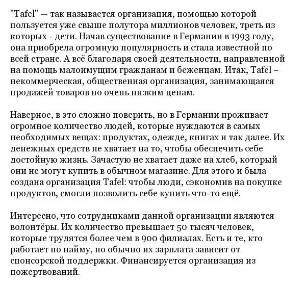 Сегодня мы хотели бы рассказать вам о клубе помощи малоимущим в Германии, который называется Deutsche Tafel. Участники этого клуба по возможности организовывают различные магазины и лавки, в которых малоимущие могут купить для себя продукты по символическим ценам. Далее вы узнаете, как это всё работает.
