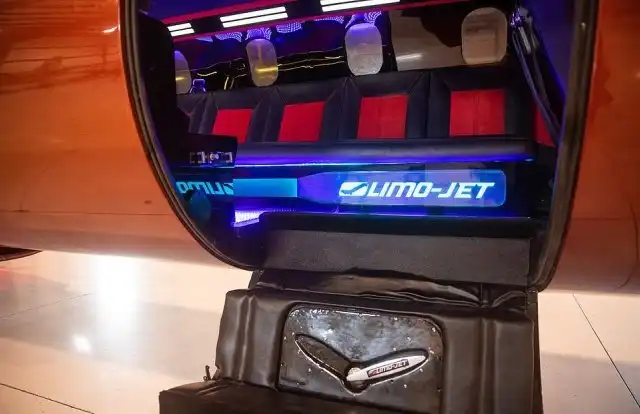 Дизайнер по имени Дэн Харрис представил свой самый необычный проект, который по сути является ночным клубом на колесах, а сделан он был из старого списанного с эксплуатации частного самолета. Этот необычный лимузин был оценен в 1 миллион долларов, он может перевозить до 8 пассажиров, а создан он был на базе фюзеляжа Learjet.