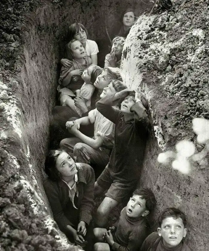 7. Дети в окопах бомбоубежища в Англии, примерно 1941 год