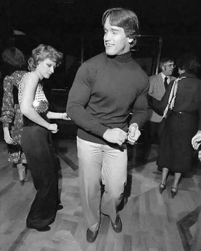 28. Девушка оценивает мощь Арнольда Шварценеггера, заглянувшего в нью-йоркский ночной клуб