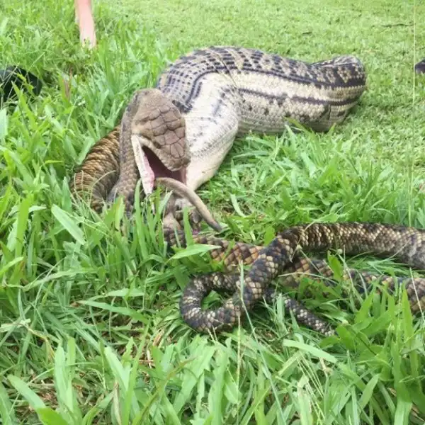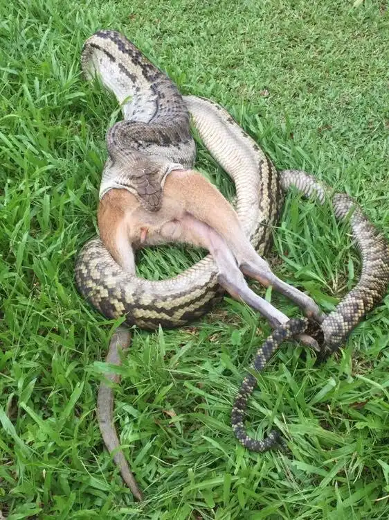 В австралийском штате Квинсленд аместитовый питон задушил и проглотил кустарникового кенгуру валлаби. Теперь самая большая австралийская змея несколько месяцев может обходиться без еды, переваривая 20 килограммовое животное.