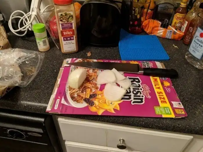 7. Если ненавидите запах рука на разделочной доске, то всегда нарезать можно на упаковке от хлопьев