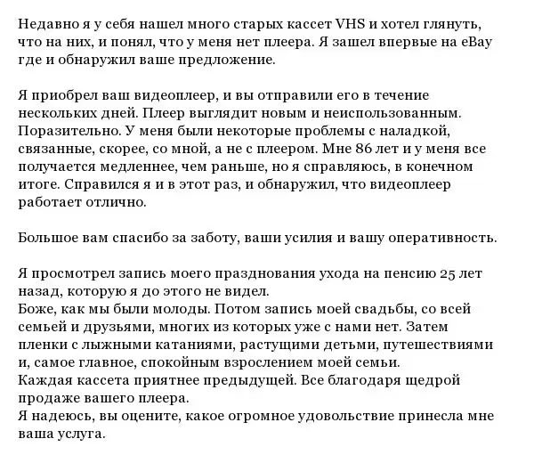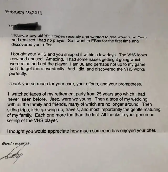 Один парень выставил на продажу на eBay свой старый кассетный плеер, который уже много лет лишь занимал место в шкафу. По его словам, покупатель нашелся практически в первый же день. Он упаковал видеомагнитофон и отправил покупателю. А всего несколько дней спустя он получил письмо.