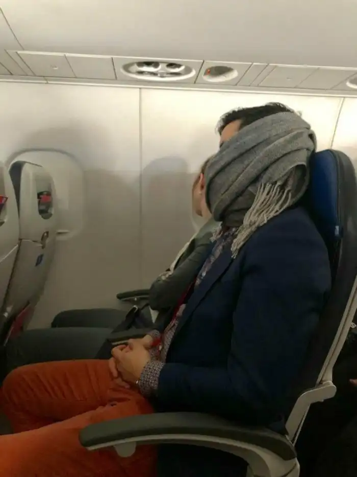 3. "Мужчина в самолете уснул и проснулся от собственного храпа. После этого он закрыл лицо шарфом, из-под которого позже доносился лишь гул"