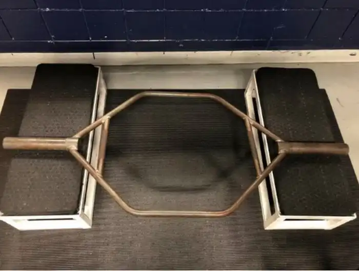 Это специальный трэп-гриф для становой тяги. На него вешают "блины", внутрь становится спортсмен и поднимает вес