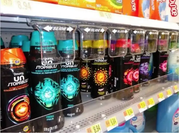 Это своеобразная защита от воров. Оказалось, что подобные моющие средства очень популярны у наркоманов. Они крадут эти бутылочки, а затем меняют их у дилеров на наркотики. А эти ползунки при сдвигании издают сильный шум, который привлекает охранников.