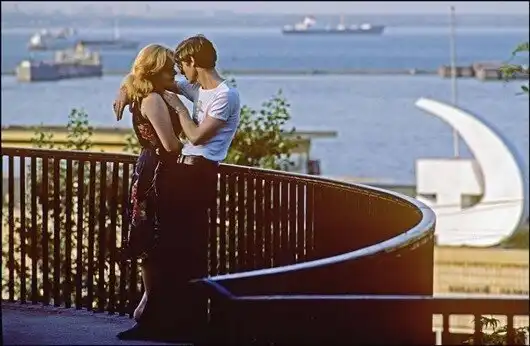 Парочка влюбленных на балконе, выходящем на порт.