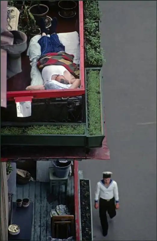 Моряк проходит под балконом, на котором отдыхает мужчина.