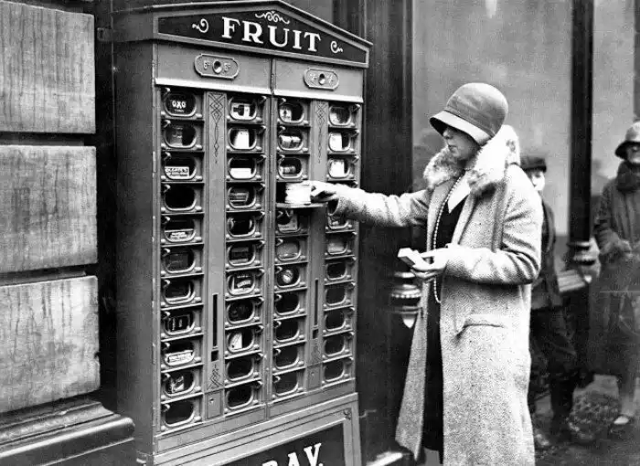 Женщина покупает еду в одном из первых торговых автоматов, Лондон, 1920 год