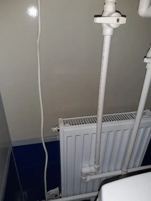 Автор этого поста пишет, что его контора занимается установкой отопительных приборов, и на этот раз они действительно "накосячили". Когда по телефону оговаривали размеры, размеры санузла и ванной комнаты, которые называл заказчик, не совпали с реальными. Поэтому радиатор в санузле "стал" очень впритык. Но после установки радиаторов приехала другая бригада, которая установила водопровод и бойлер...