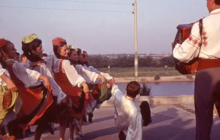 Тирасполь. Участники фольклорного ансамбля «Дружба» показывают на берегу Днестра молдавский народный танец