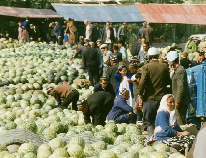Окрестности Самарканда. Работники совхоза отдыхают, угощаясь виноградом, дынями и чаем во время сбора урожая хлопка, а работницы готовят основное блюдо
