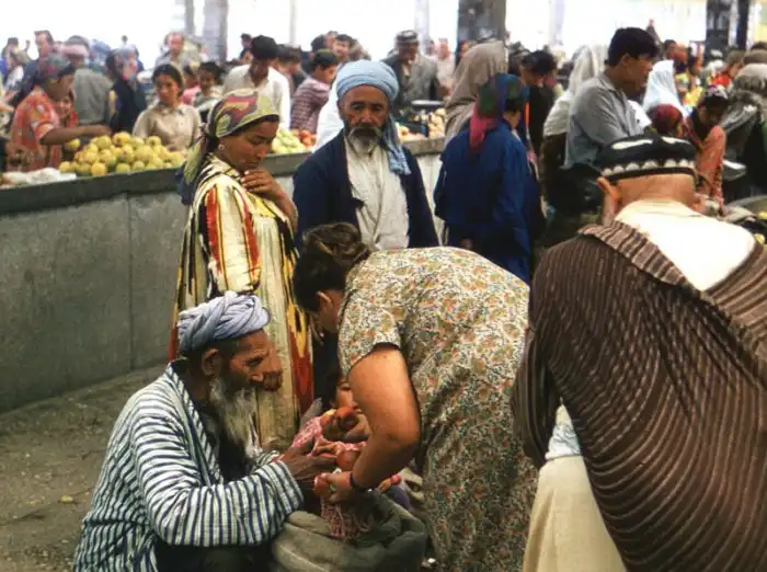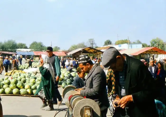 Самарканд. На рынке человек ищет деньги, чтобы заплатить за заточку ножниц