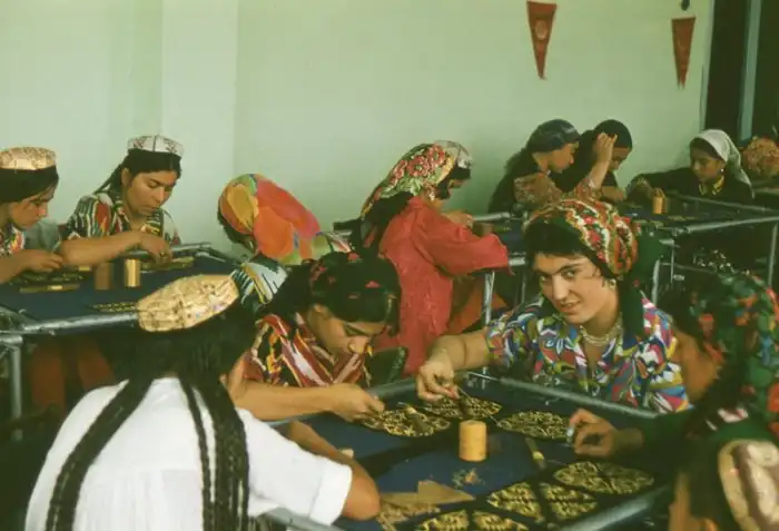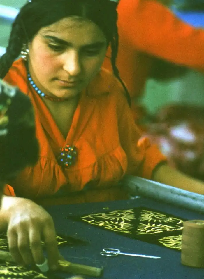 Самарканд. Молодые женщины на фабрике, специализирующейся на серебряной вышивке, делают «Тюбетейки», типичный узбекский головной убор