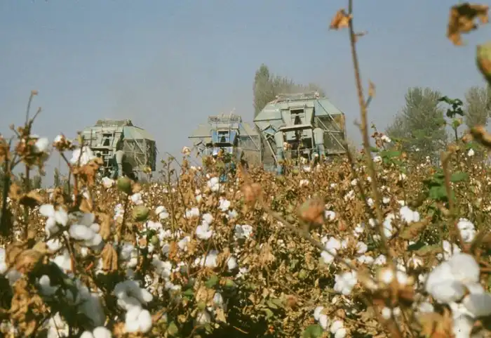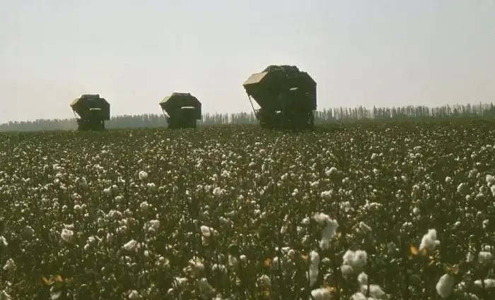 Окрестности Самарканда. Хлопкоуборочные комбайны за работой на поле специализированного совхоза