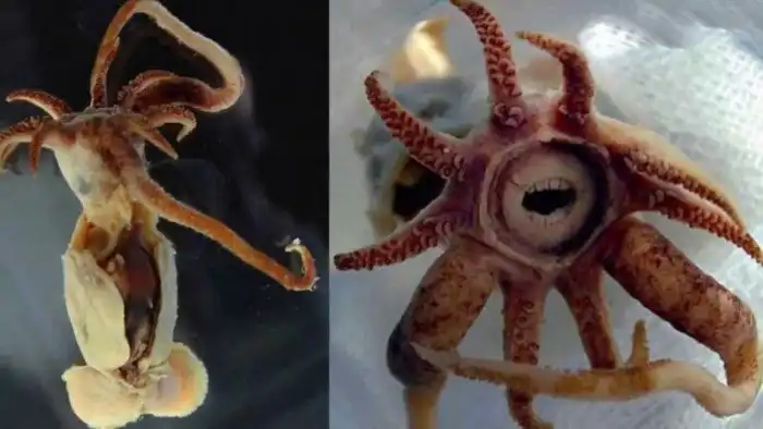 21. Это необычный кальмар, а Promacthoteuthis sulcus, и то, что многие принимают за зубы, на самом деле его губы