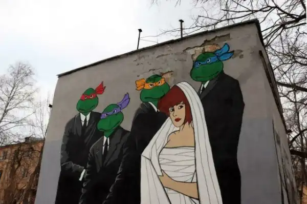 Уличный художник Слава ПТРК нарисовал «Черепашки-ниндзя» в той же позе, в какой изображены герои «Бригады» на постере фильма. Вместо жены Саши Белого на рисунке героиня мультфильма — подруга черепашек-ниндзя Эйприл О’Нил.