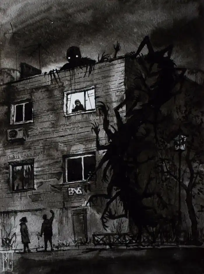 Теперь на работах Бориса всевозможные человеческие кошмары подстерегают людей возле домов, на дорогах, в лесу и даже на кухне. И хоть эти гиганты никого и не убивают, но выглядят чертовски пугающе — прямо как в самых сочных людских кошмарах.
