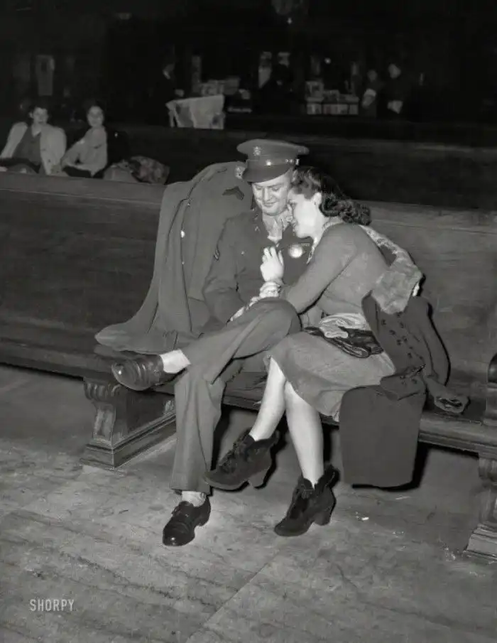Солдат и его девушка в ожидании поезда на станции Чикаго Юнион, Джек Делано, февраль 1943 года