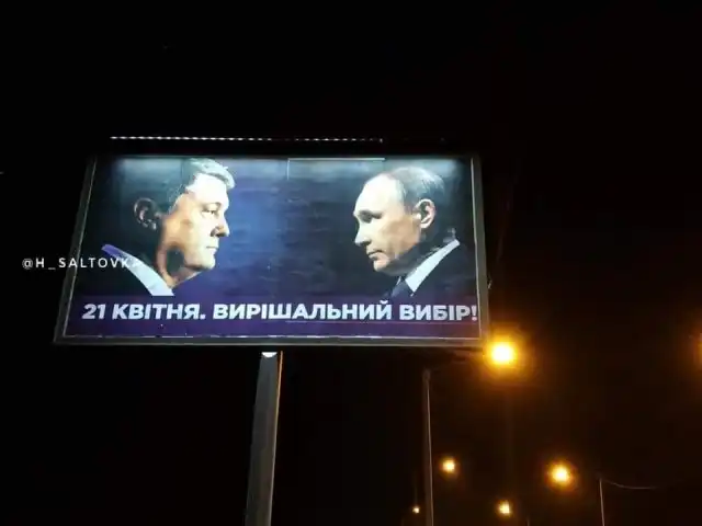 После того, как стало известно об итогах первого тура президентских выборов, в Украине началась рекламная кампания кандидатов перед вторым туром. На этот раз в Харькове появились вот такие агитационные билборды, которые сфотографировала и выложила в Facebook журналистка Ольга Волкова. На плакатах изображен действующий президент Украины Петр Порошенко тет-а-тет с президентом России Владимиром Путиным, а снизу написано: "21 апреля. Решающий выбор". Вместо своего соперника во втором туре Владимира Зеленского Порошенко изобразил Путина.
