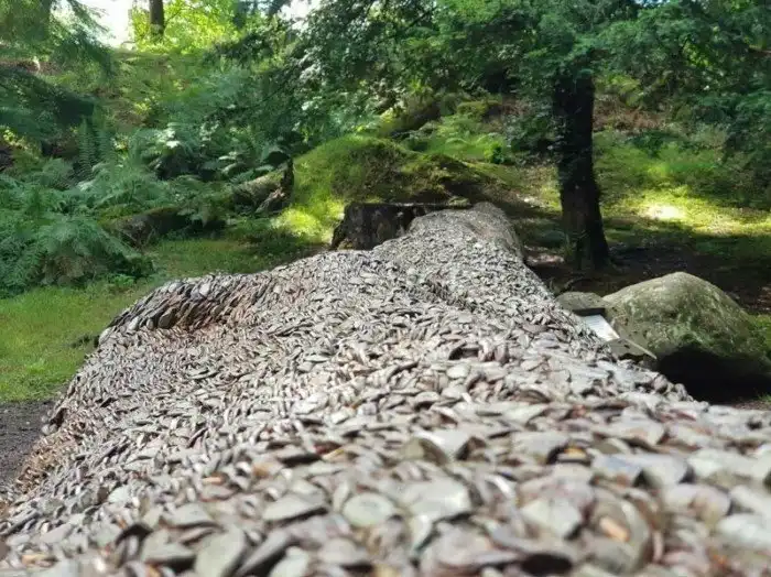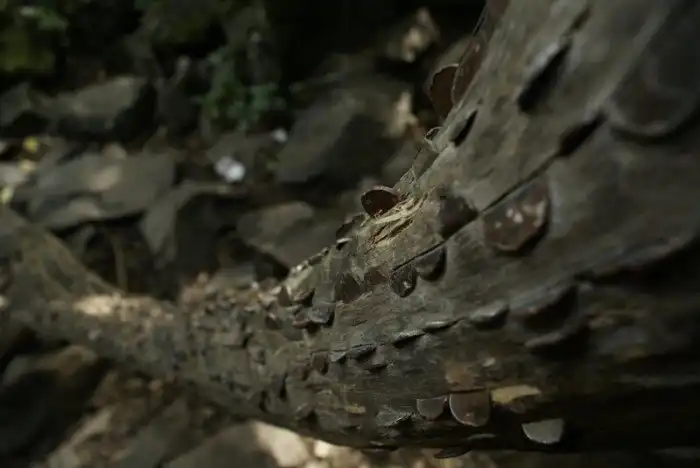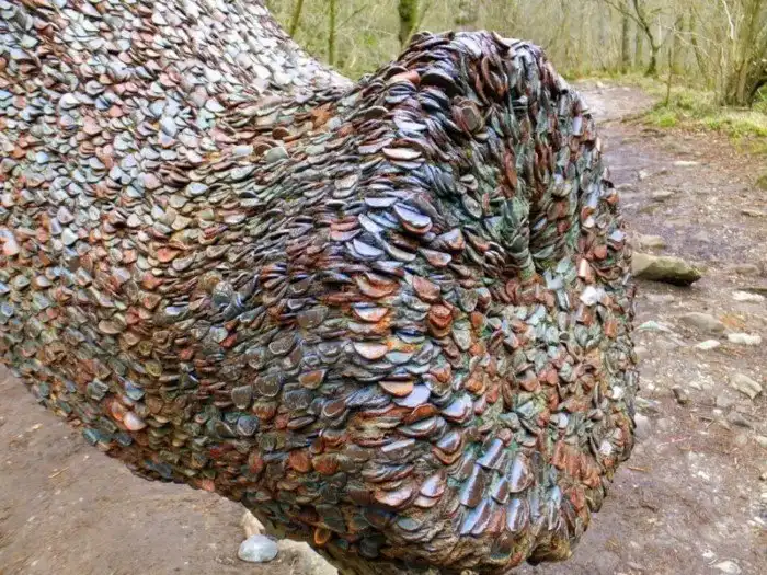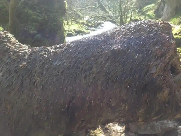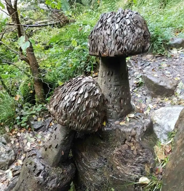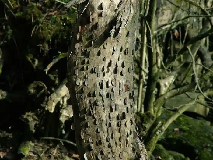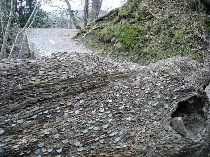 Кора срубленных деревьев (многие из них уже очень старые) буквально "окутана" сеткой из монет, которые жители вбивали при помощи молотков, камней и прочего подручного материала