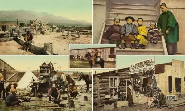 Завораживающие цветные изображения 120-летней давности запечатлели, какой была жизнь на Диком Западе, и раскрывают суровую реальность эпохи Золотой Лихорадки. Эти потрясающие цветные изображения, относящиеся к началу 19 века, показывают сурового ковбоя, размахивающего лассо, задумчивого шахтера, наслаждающегося дымом в дверях землянки, и торговца-первопроходца, продающего свои товары из ветхого деревянного магазина. Многие из фотохромов были сделаны в Колорадо в 1880-х и 1890-х годах, когда золотая лихорадка в 1850-х привлекла толпы старателей, желающих сделать состояние.
