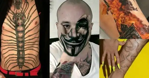 Татуировки тоже могут быть модными, откровенно неудачными и даже сделанными "по горячим следам". Пользователи соцсети Reddit поделились фото татушек, которые им запомнились в последнее время. Среди них есть и нелепые, и те, что иначе как стёбом не назовешь, Кого-то удивили откровенно страшные изображения. А некоторые можно было набить только в хорошем подпитии.
