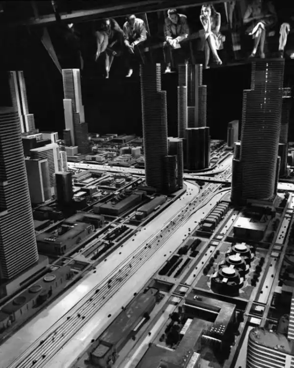 Посетители рассматривают макет на выставке “Футурама“. Нью Йорк, 1939 год