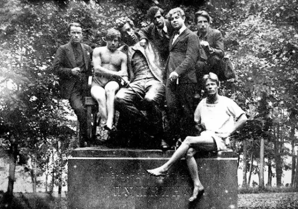 Сергей Есенин и его товарищи устроили фотосессию верхом на памятнике Пушкину, Детское Село, 1924 год