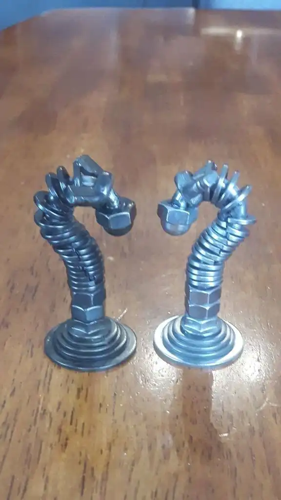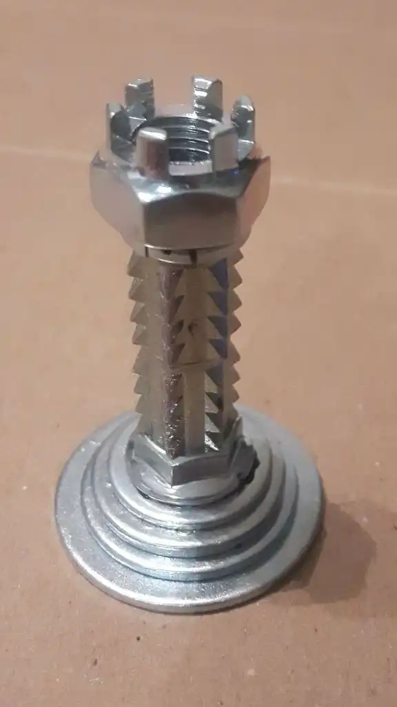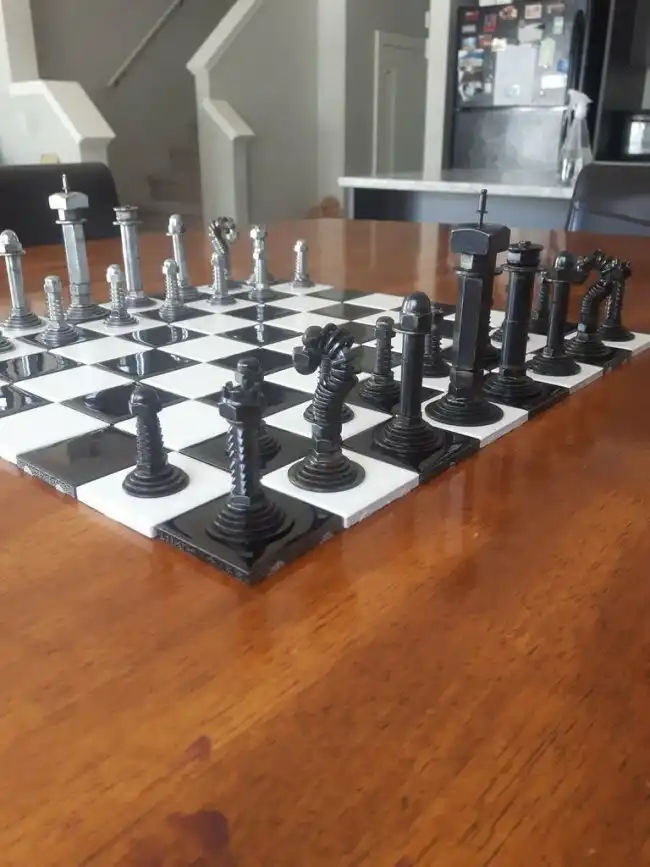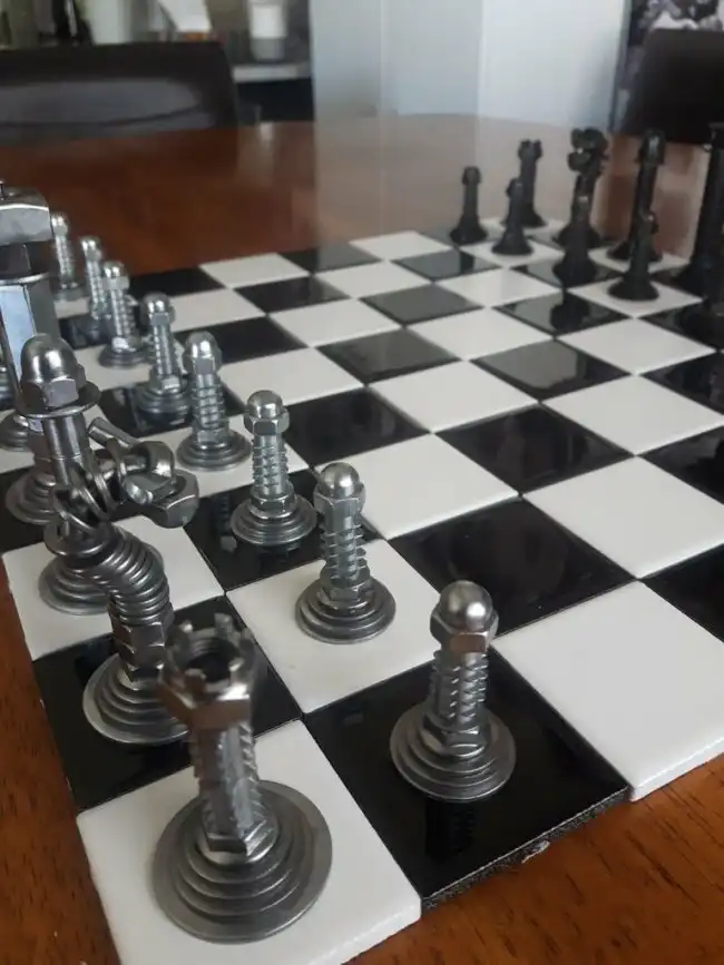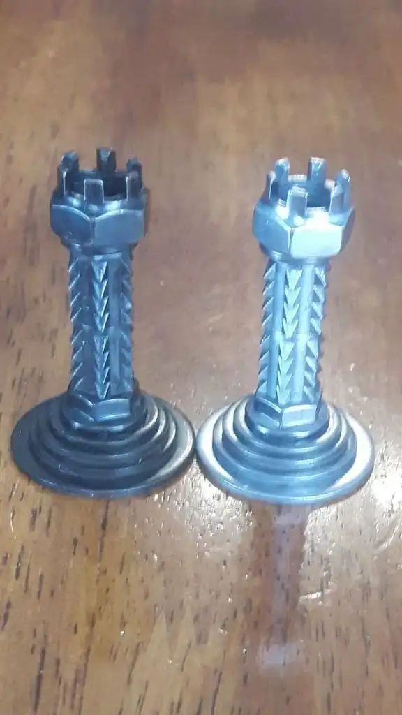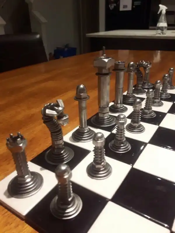 Для сборки таких шахматных фигур нужны следующие инструменты и материалы: резьбовые стержни, шайбы, гайки, резьбовые вставки, эпоксидный клей, лимонная кислота, лак, краска, шлифовальный диск, плоскогубцы.
