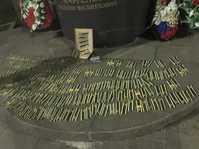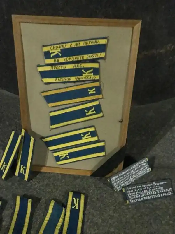 На погонах, выложенных у памятника Маргелову, написано: "Снимая с нас погоны, вы хороните память".