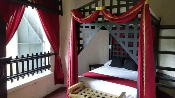 Тут есть две гостевые комнаты, каждая из которых рассчитана на 4 человек, и номер люкс, в котором могут разместиться 12 человек. Также в замке есть гостиная и тюрьма с камерами, в которых тоже можно пожить.