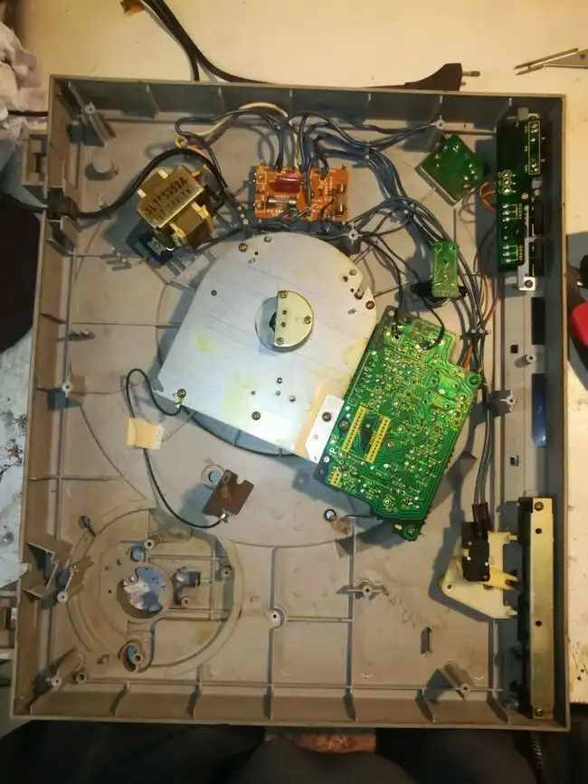 На чердаке дома автор поста нашел старый проигрыватель пластинок, пролежавший там около 20 лет. Многие детали и соединения были окислены и испорчены, но при включении в сеть двигатель работал и диск крутился. Тогда автор решил попытаться восстановить проигрыватель, используя детали от других устройств.