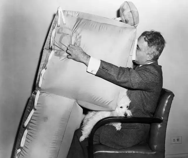 Изобретатель Асен Йорданов демонстрирует созданную им подушку безопасности для пассажирских самолётов, 1957 год