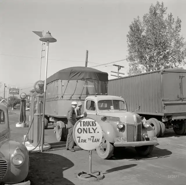 Грузовые автомобили на станции технического обслуживания на Бладенсбург-роуд (Route 1), Вашингтон, округ Колумбия. Июнь 1940 года