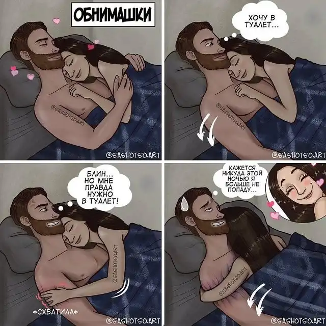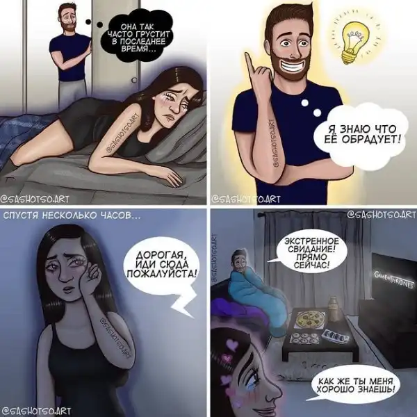 Рассвет отношений - это прекрасно. Но конфетно-цветочный период всегда быстро заканчивается и наступает эра "быта". Но любые трудности в отношениях можно преодолеть, если относиться к ним с юмором и толикой иронии. Забавный и очень жизненный комикс об отношениях от художницы из Казахстана Саши Цой, которая проиллюстрировала бытовые ситуации со своим парнем.