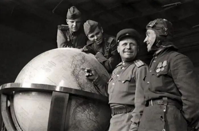 8. Советские солдаты у глобуса Гитлера, 1945 год