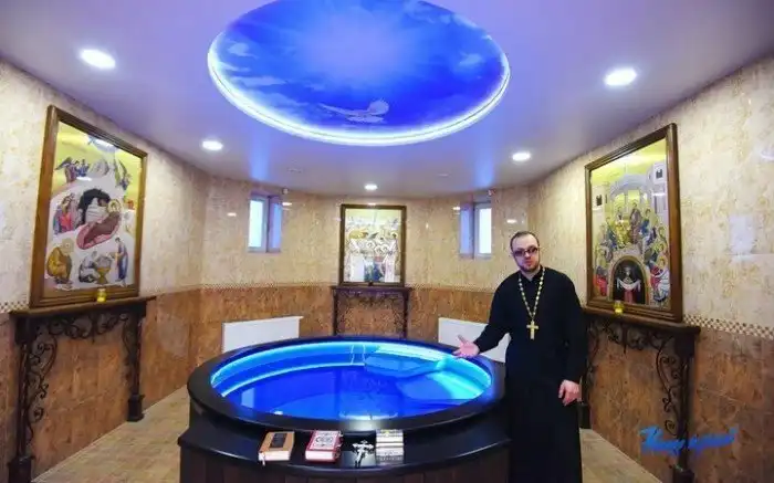 И бонус. Просто так. Красиво же...В Барановичах (Беларусь) в православной церкви сделали купель с подсветкой и подогревом святой воды