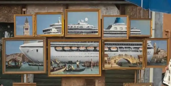 Его работа называется - "Venice in Oil". Перевод звучит довольно двусмысленно. Можно перевести как "Венеция написана маслом", или же "Венеция в топливе". Название более, чем доходчиво выражает мысли художника. Прохожие сразу же оценили работу, но полицейские были другого мнения. Сотрудники правопорядка объяснили, что у него нет разрешения показывать картины в данном месте и отправили его восвояси.