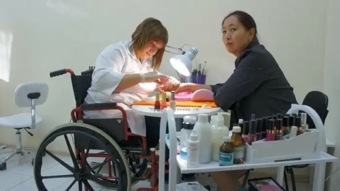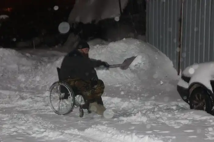 18. Мужчина в инвалидном кресле - коляске расчищал двор от снега и наледи, чтобы была возможность выехать, пройти и проехать