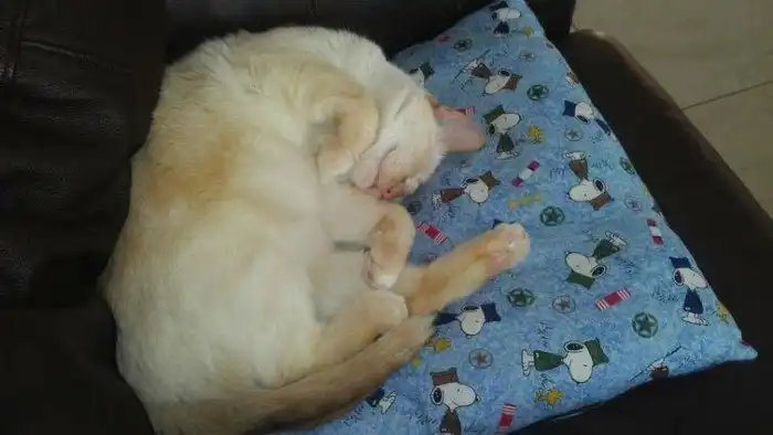 "Прошло почти 2 года с тех пор, как истощенный кот попал на наш двор. Вот он сейчас спит на подушке, которую я сделала на уроке дизайна"