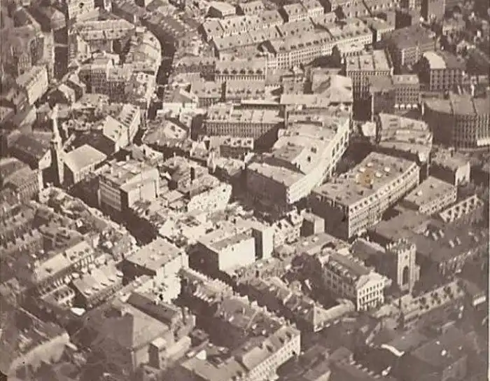Бостон, 1860 год. Это самая старая из сохранившихся фотография, снятая с высоты птичьего полета. Ее сделал американец Джеймс Уоллас Блэк 13 октября 1860 года, поднявшись на аэростате на высоту 630 метров. На этом снимке видны две исторические достопримечательности: Старая южная церковь, построенная в неоготическом стиле, и первоначальная церковь Троицы, которая вскоре будет разрушена большим бостонским пожаром в 1872 году и затем заново отстроена.