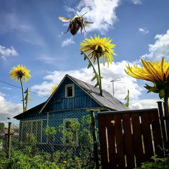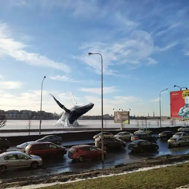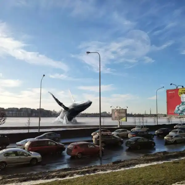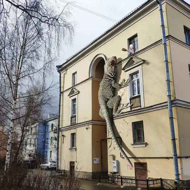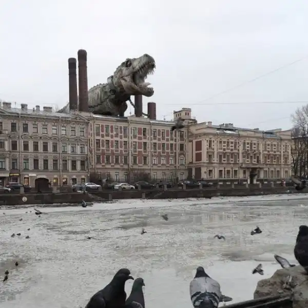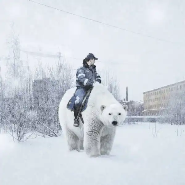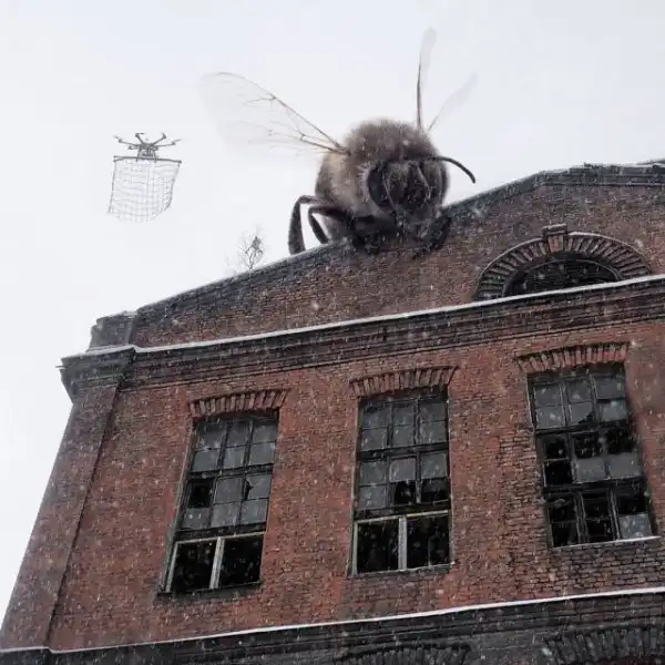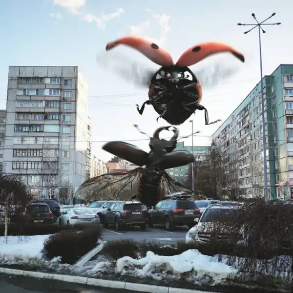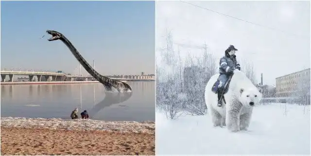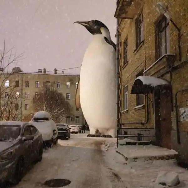 Гигантские существа на крышах зданий, полицейский на медведе, огромные пингвины и голуби на улицах и многие другие невероятные образы почти ежедневно публикуются в Instagram художника.