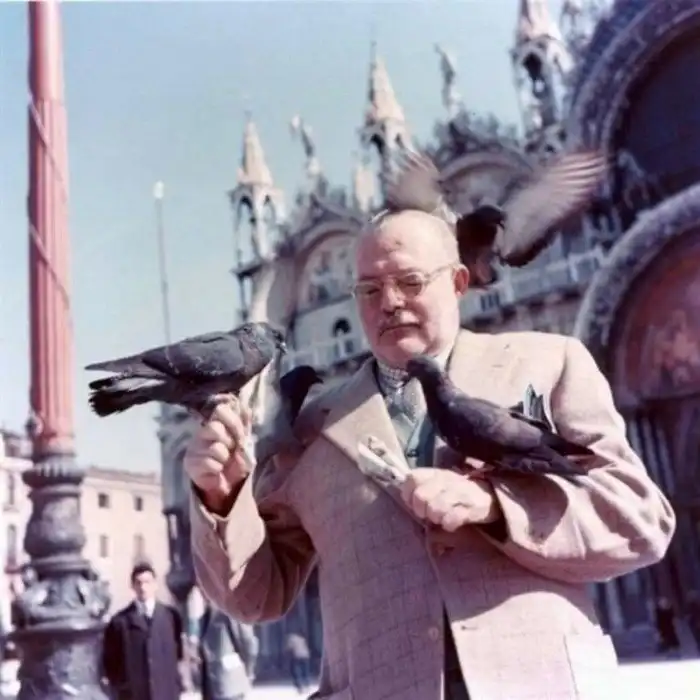9. Эрнест Хемингуэй кормит голубей в Венеции, 1954 год.