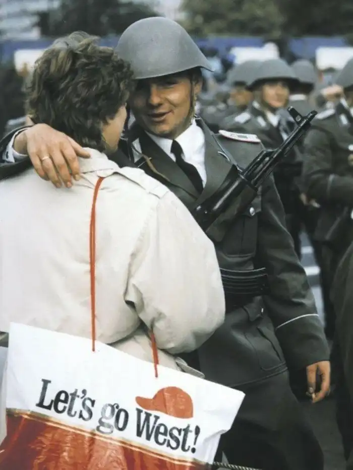 28. Солдат после парада, посвященного 40-летию ГДР, обнимает жену. Примечательна надпись на пакете. Берлин, 1989