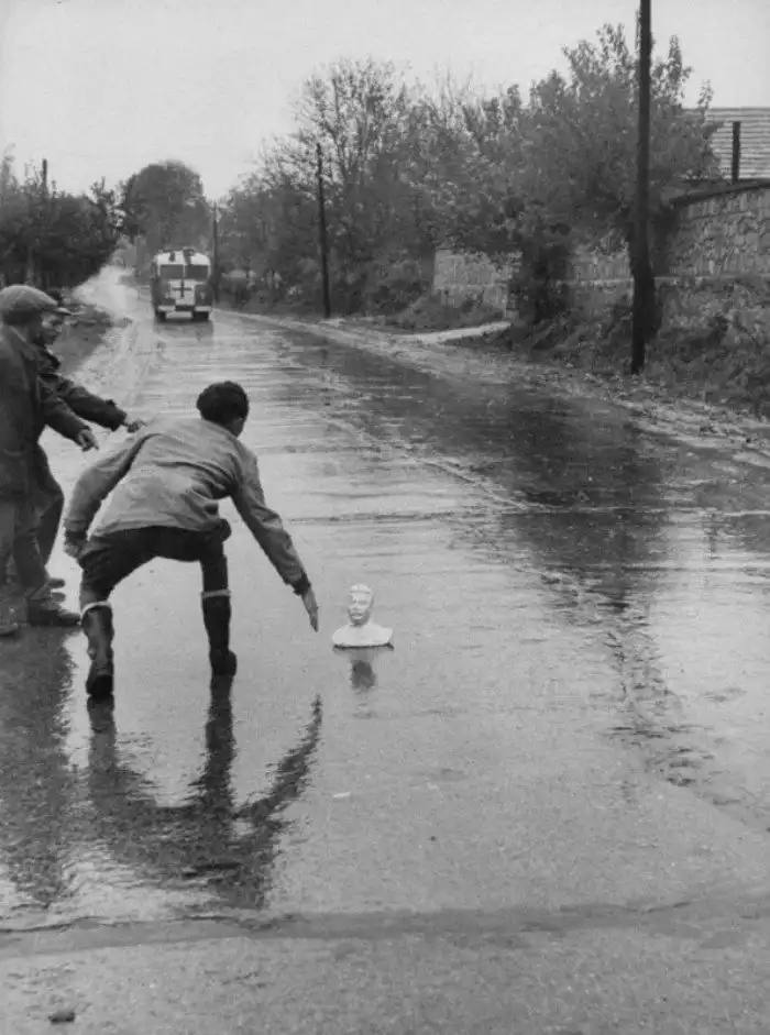 32. Венгры подкладывают бюст Сталина под автобус, 1956 год.