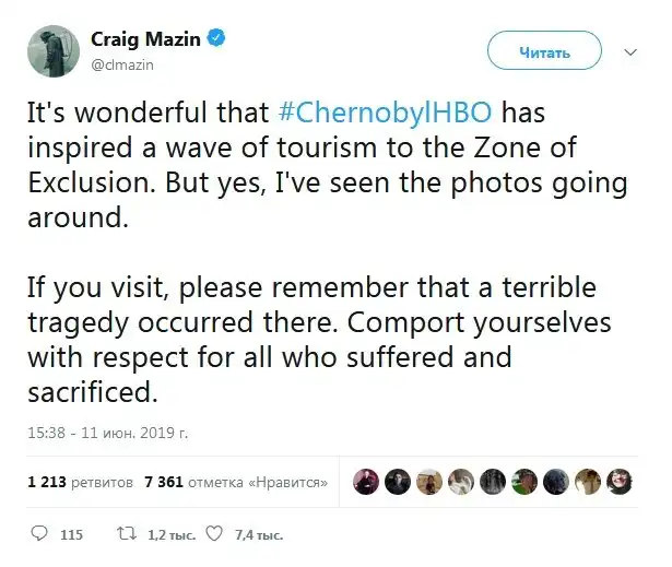 "Это замечательно, что "Чернобыль" вдохновил туристов на поездки в зону отчуждения, но да, я видел фотографии. Если вы планируете туда поехать, помните, пожалуйста, что там произошла страшная трагедия. Отнеситесь с уважением к жертвам катастрофы".