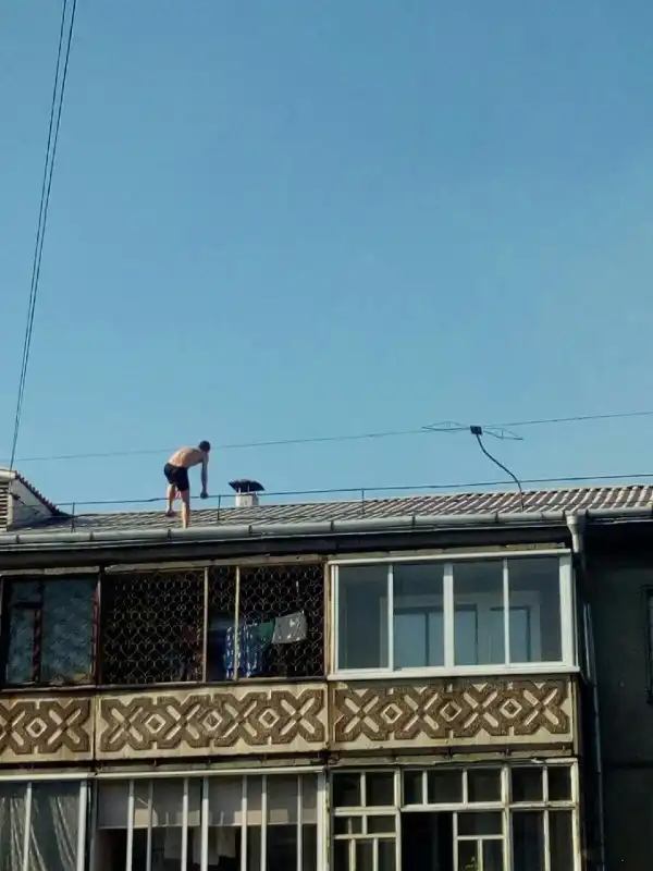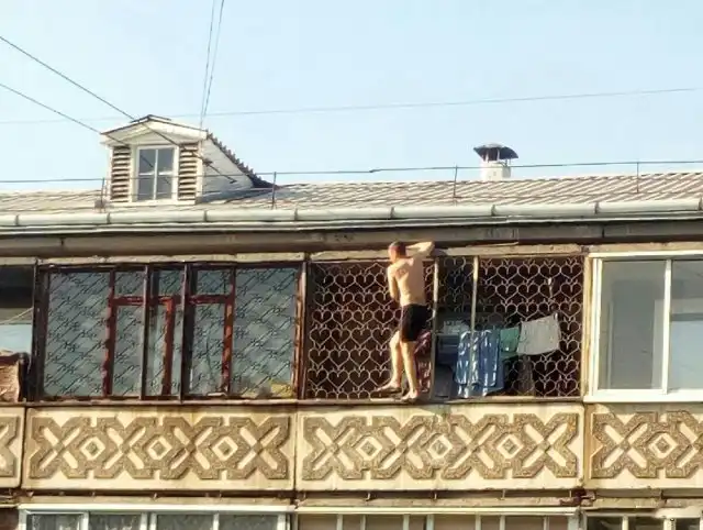 Очевидцы сфотографировали альпинистские способности своего соседа, который вылез через балкон на 5-м этаже и по решетке забрался на крышу дома. Потом он уютно улегся на шифере и приступил к принятию солнечных ванн.